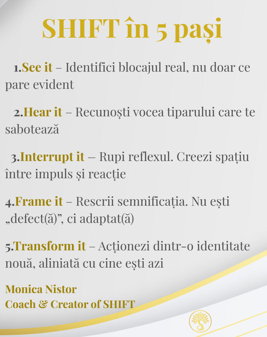 Nu e despre „mai mult mindset”, ci despre a înțelege de ce reacționezi așa cum o faci.Lucrăm exact acolo unde se întâlnesc lumea din afară și lumea din interior —locul unde se nasc blocajele reale, dar și accesul la claritate.Printr-un proces în 5 pași, SHIFT scoate la lumină regulile tăcute care ți-au condus viața,le aduce în conștiență și te ajută să le rescrii pas cu pas,